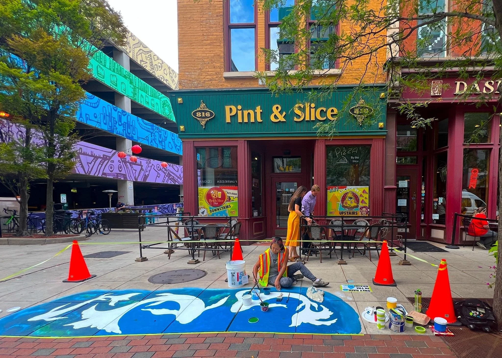 Location: 816 Calhoun Street, Fort Wayne, IN 46802 on the sidewalk in front of Pint & Slice