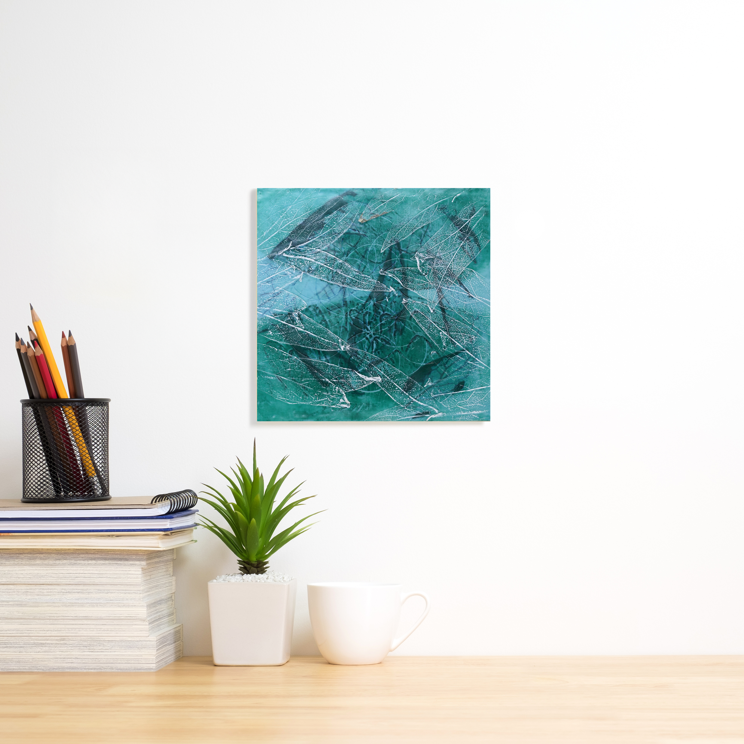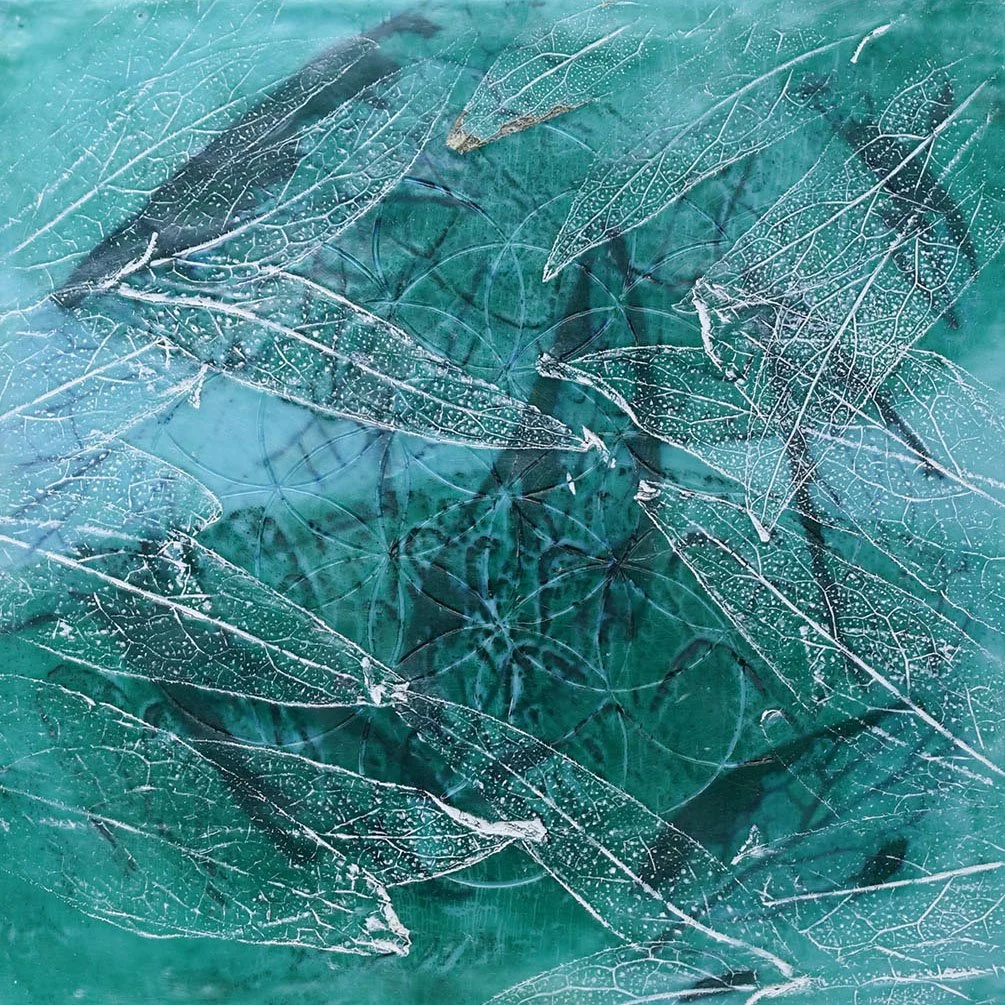 Hidden Growth is an encaustic painting that reveals the subtle and often unseen forces of nature at work. With a soothing teal background, the painting is layered with imprints of comfrey leaves, symbolizing the healing and regenerative power of the natural world. The flower of life symbol is delicately carved into the translucent wax, partially hidden by its transparency, offering only glimpses of the intricate geometry. Smaller comfrey leaves, carefully arranged to gently allowing the flower of life to peek through at the center. Hidden Growth is a reminder that beneath the surface, growth and healing are always happening, even when unseen, woven quietly into the fabric of existence.